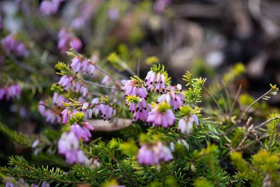 Erica can be prostrate or erect, evergreen shrubs with fine, needle-like leaves in whorls, and racemes or panicles of small, bell-shaped or tubular flowers
