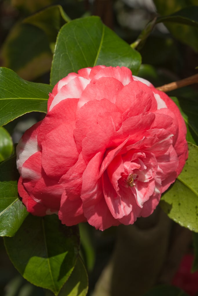 An evergreen shrub with dark green glossy leaves and double, carmine rose-shaped flowers, often streaked with white in the centre, appearing in the spring