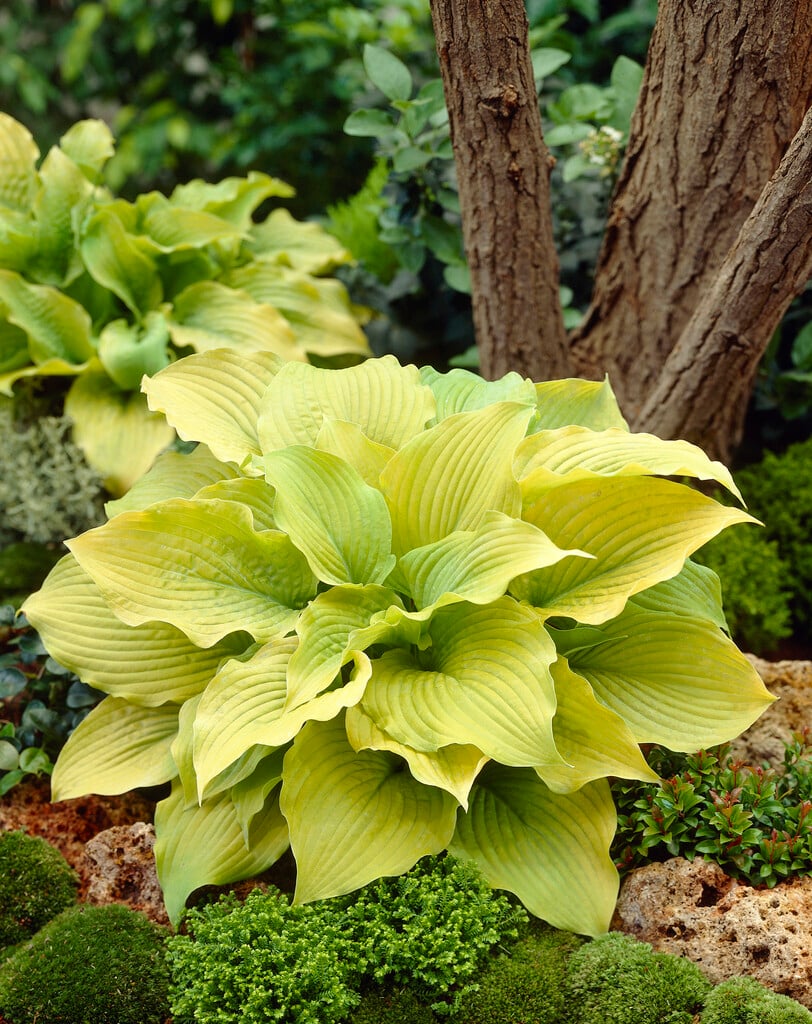 Hosta are clump-forming herbaceous perennials with simple, ovate or lance-shaped leaves, often attractively coloured or variegated, and erect racemes of nodding, funnel or bell-shaped flowers in early summer