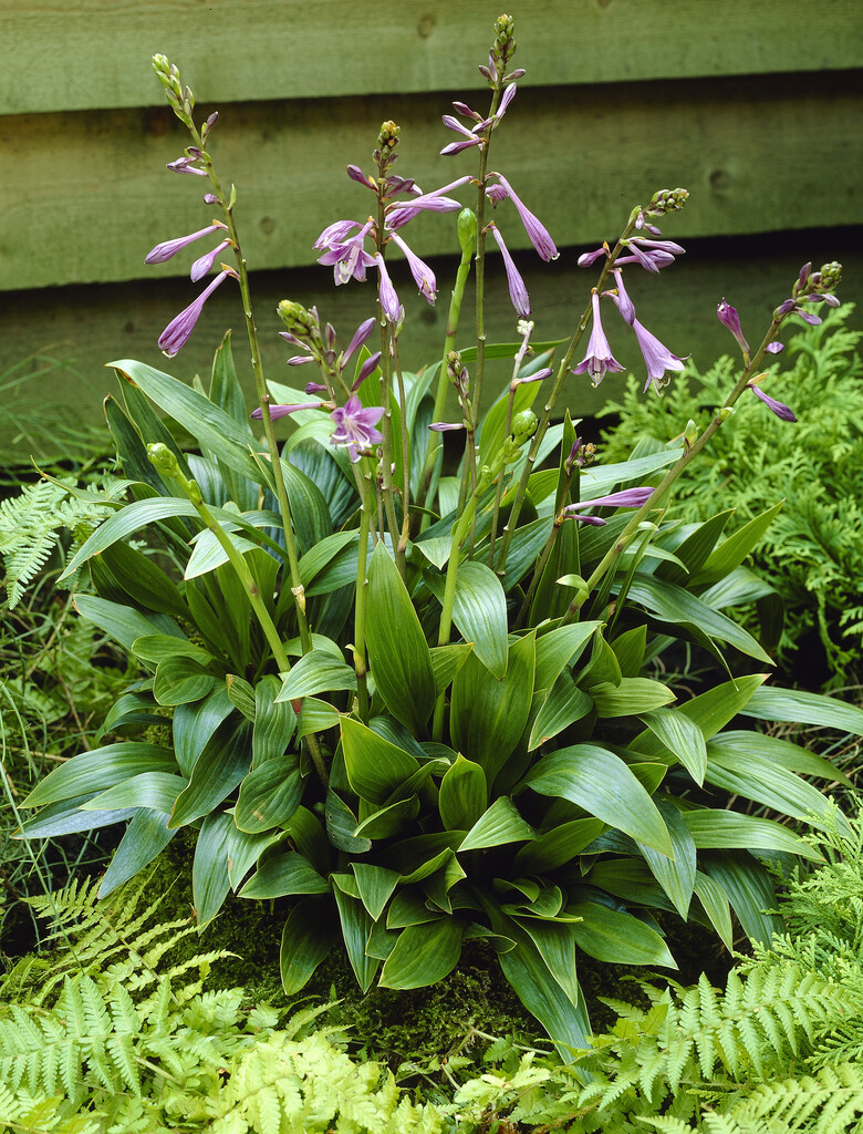 Hosta are clump-forming herbaceous perennials with simple, ovate or lance-shaped leaves, often attractively coloured or variegated, and erect racemes of nodding, funnel or bell-shaped flowers in early summer