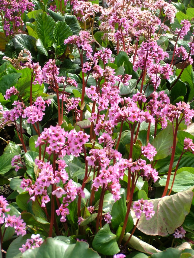 Bergenia are evergreen rhizomatous perennials with leathery, rounded leaves and dense, erect clusters of bell-shaped pink or white flowers in spring