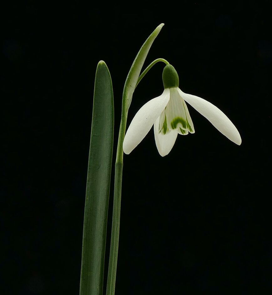 Galanthus are dwarf bulbous perennials with linear or strap-shaped leaves, and solitary, often honey-scented, nodding flowers with 3 white outer tepals and 3 smaller inner ones often marked with green