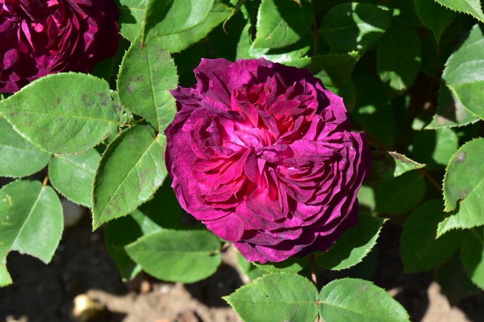Compact rose about 90cm tall, with upright growth, thorny stemss and plentiful very dark green foliage. Very free-flowering and repeating through summer, with richly fragrant, fully double, dark crimson-purple rosette blooms paler on the outer petals and very flat when opened. Prefers a warm, dry climate. 1855