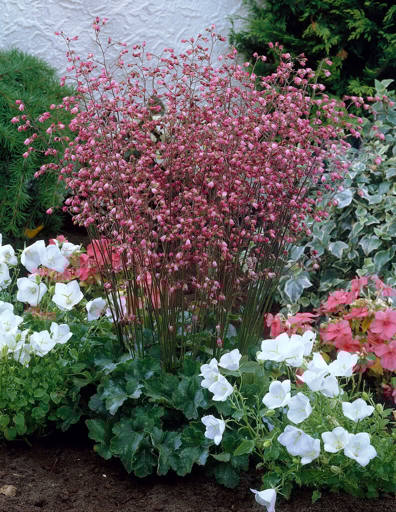 Heuchera are more or less evergreen, clump-forming perennials with attractive, rounded, shallowly palmately lobed leaves and racemes or panicles of small, tubular flowers, often with colourful calyces