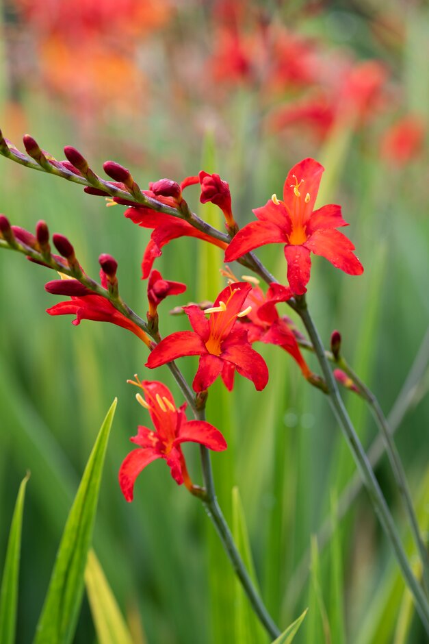 Crocosmia are deciduous cormous perennials with erect, sword-shaped leaves and branched spikes of showy, funnel-shaped flowers in summer