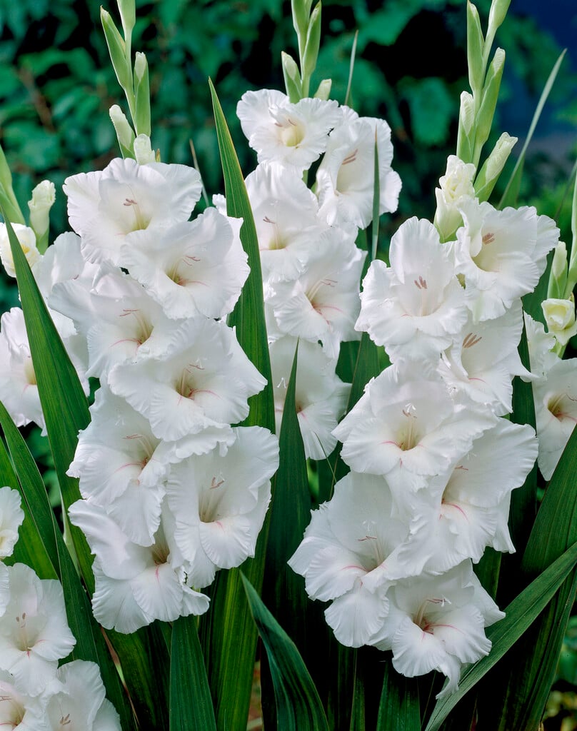 A large-flowered gladiolus, up to 90cm tall, with green sword like leaves and flower spike with of over 10 flower buds, the very large blooms are crisp white, adding chic blooms for the summer and into early autumn