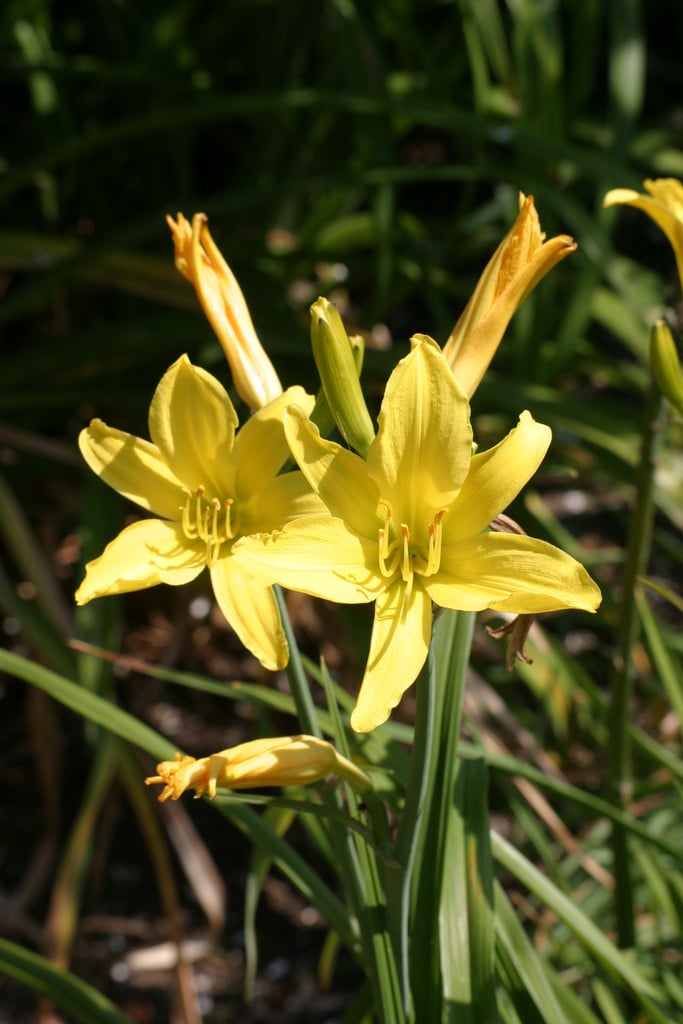 Hemerocallis may be evergreen or herbaceous perennials, with narrow, strap-shaped leaves and funnel-shaped flowers on erect stems in late spring or early summer