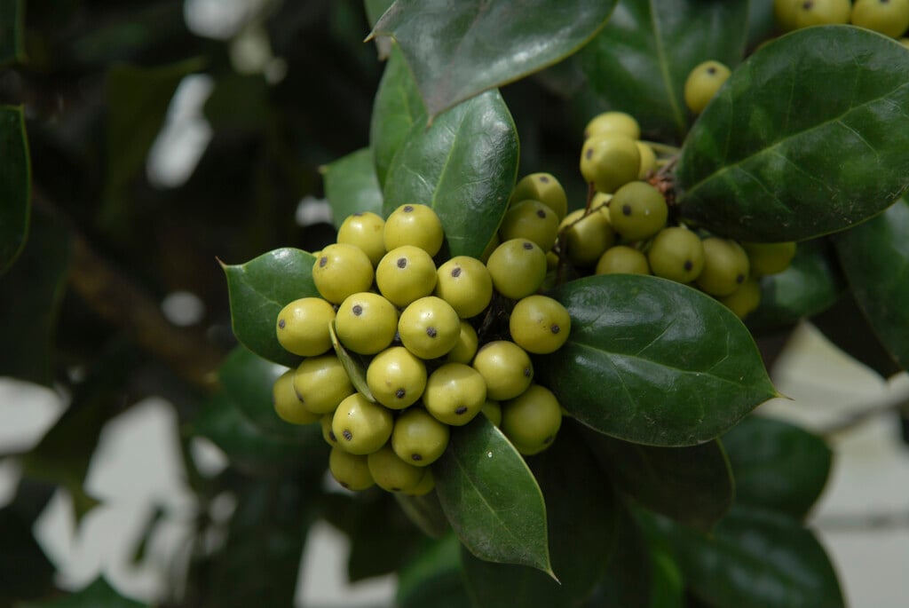 Large, rounded, slow-growing shrub to 4m in height, with rectangular, leathery, glossy green leaves with a terminal spine only. Small white female flowers in late spring are followed by freely produced large red berries if pollinated by a male cultivar; the berries often remain on the plant until winter