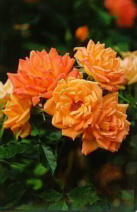 Small, bushy, free-flowering rose about 60cm tall and wide, with neat, dark green foliage, and clusters of pink-tinged orange-yellow, semi-double blooms, repeat-flowering in summer and autumn