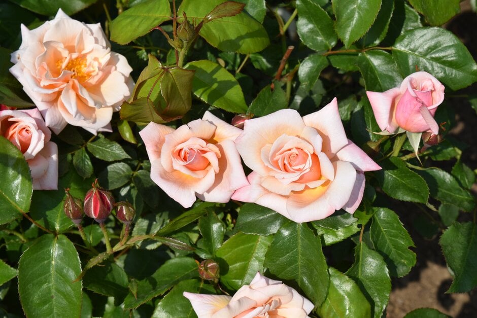 Vigorous, bushy rose about 75cm tall, with healthy, dark green, glossy foliage. Produces large clusters of large, fragrant, pale peachy-pink, loosely formed, semi-double blooms, flowering freely and repeatedly through summer to autumn