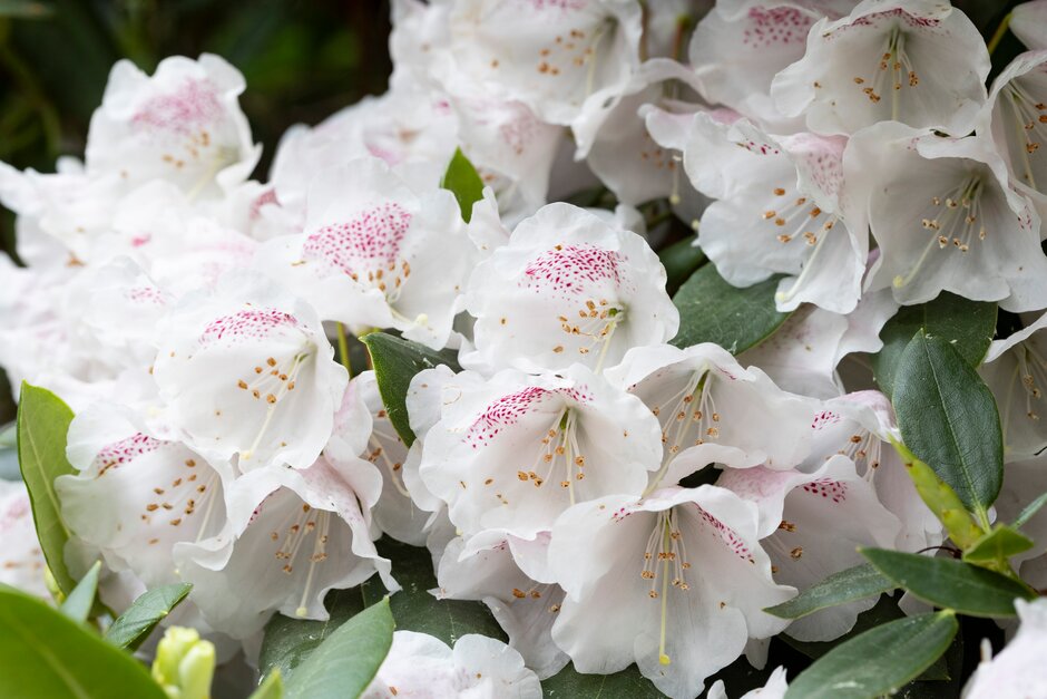 Evergreen species with a rounded habit, growing to 2.5m tall, with ovate-elliptic pale green leaves to 10cm long, and rounded heads of bell-shaped white flowers to 4cm long, flushed pink, with reddish-purple spots, in mid and late spring