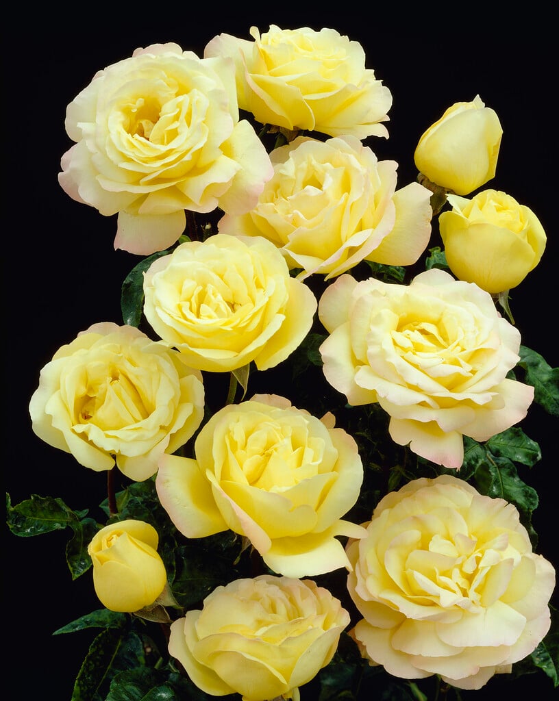 Compact, bushy rose to 75cm tall, with glossy dark green foliage and large, fragrant, high-centred, fully-double primrose-yellow blooms produced in abundance from summer to autumn
