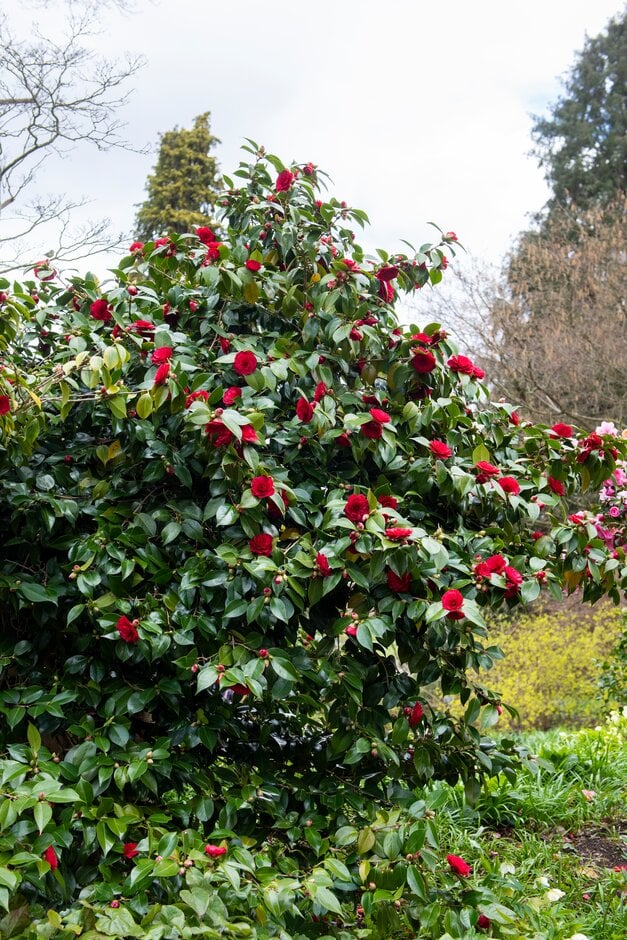 Camellia are evergreen shrubs with simple, ovate, glossy, leathery leaves and showy flowers with solitary or clustered flowers early in the year
