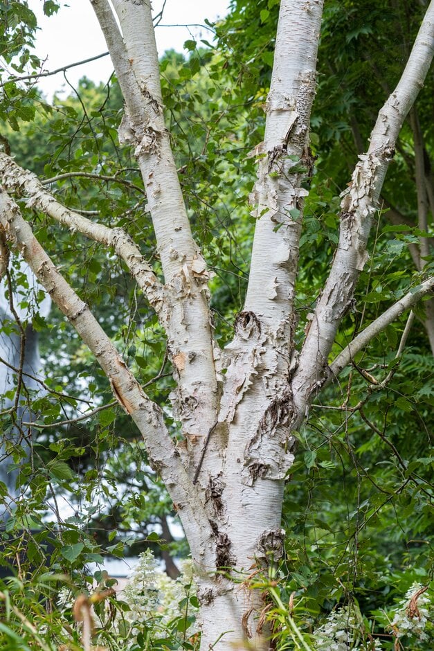 A slow-growing, deciduous hybrid tree with peeling creamy-white bark on the trunk and branches, and ovate leaves which emerge glossy-green in the spring and change to shades of yellow in the autumn. Suitable for smaller gardens, this variety has a narrower head than other varieties and in ideal conditions may reach a maximum height of around 6m. Will tolerate most types of soil, even wet, but best on acid soils to achieve the maximum height