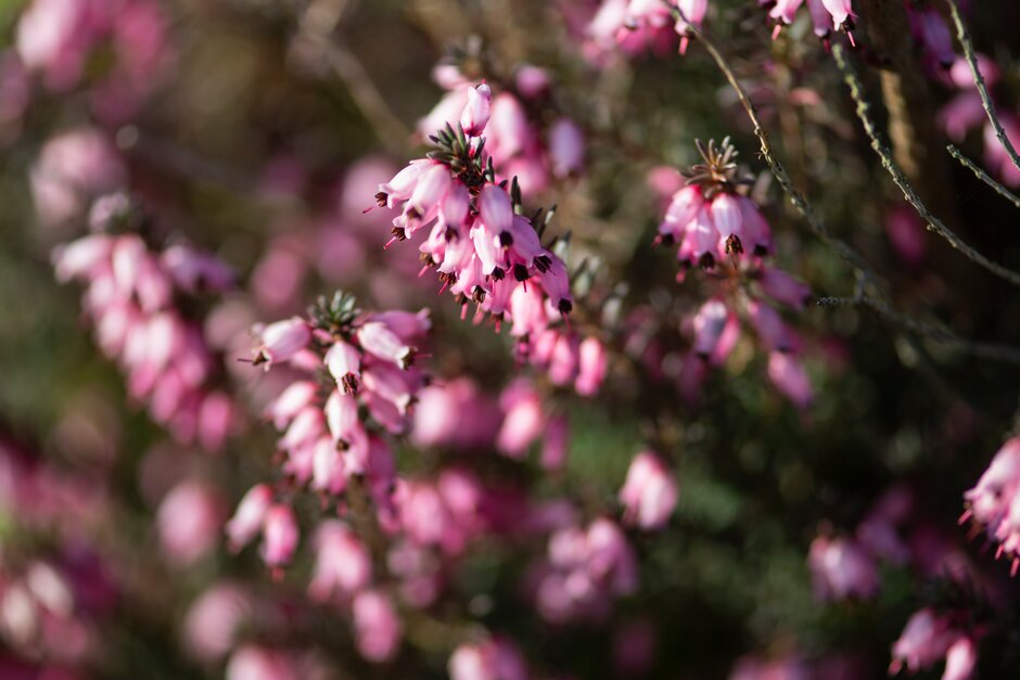 Erica can be prostrate or erect, evergreen shrubs with fine, needle-like leaves in whorls, and racemes or panicles of small, bell-shaped or tubular flowers