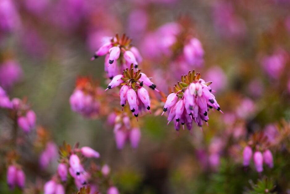 Erica can be prostrate or erect, evergreen shrubs with fine, needle-like leaves in whorls, and racemes or panicles of small, bell-shaped or tubular flowers