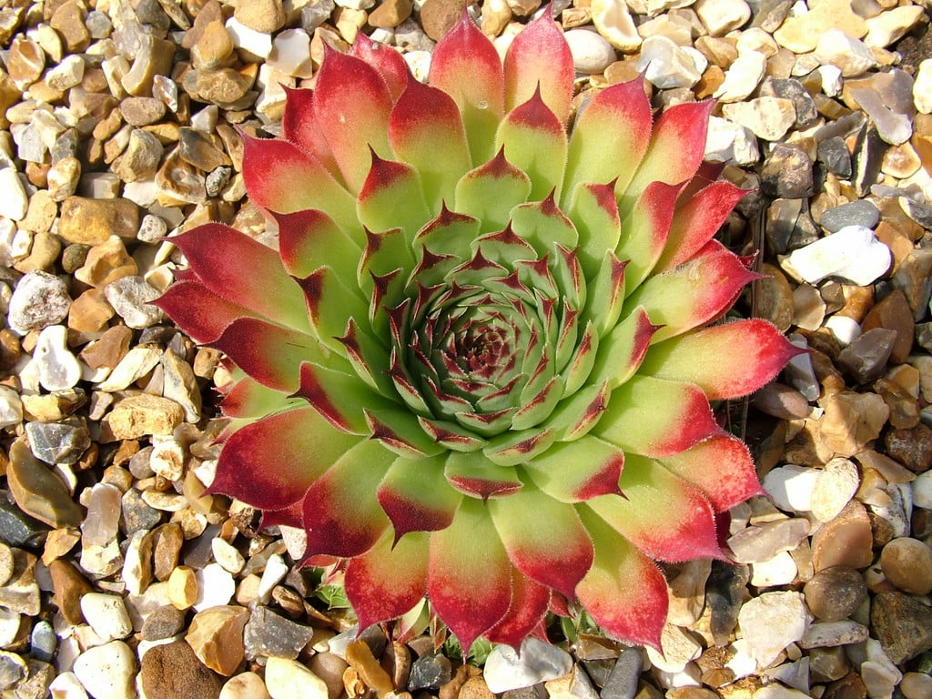 Sempervivum are evergreen perennials forming mats of fleshy-leaved rosettes, often attractively coloured, with star-shaped pink or pale yellow flowers in summer