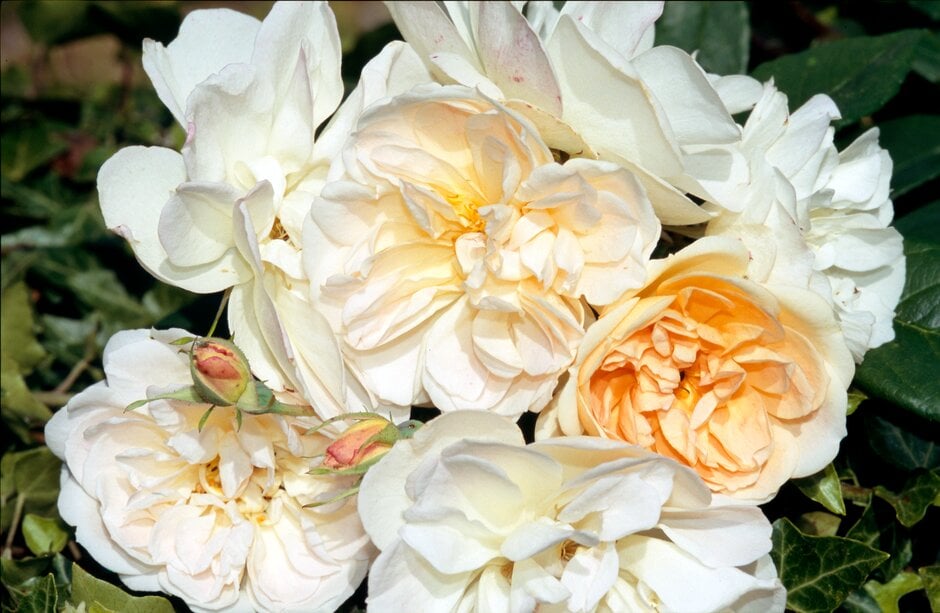 A seedling of 'Kiftsgate', a very large, vigorous rambler rose about 6-8m tall or more, with mid-green foliage tinted crimson when young, and large trusses of very fragrant, semi-double, creamy-apricot blooms that age to blush pink, flowering in midsummer, then small, rounded orange-red hips follow; foliage becomes a rich, russet colour in autumn