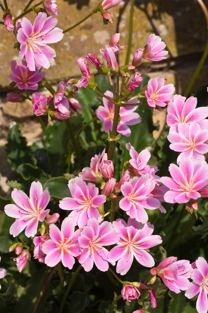 Lewisia can be herbaceous or evergreen perennials forming rosettes of fleshy leaves, with panicles of open funnel-shaped flowers in a wide range of colours in spring and summer