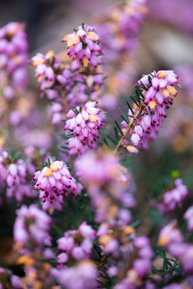 Erica can be prostrate or erect, evergreen shrubs with fine, needle-like leaves in whorls, and racemes or panicles of small, bell-shaped or tubular flowers