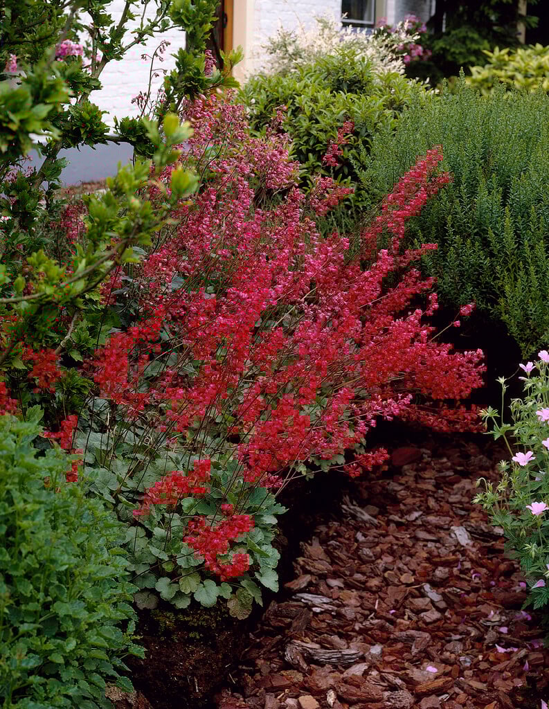 Heuchera are more or less evergreen, clump-forming perennials with attractive, rounded, shallowly palmately lobed leaves and racemes or panicles of small, tubular flowers, often with colourful calyces
