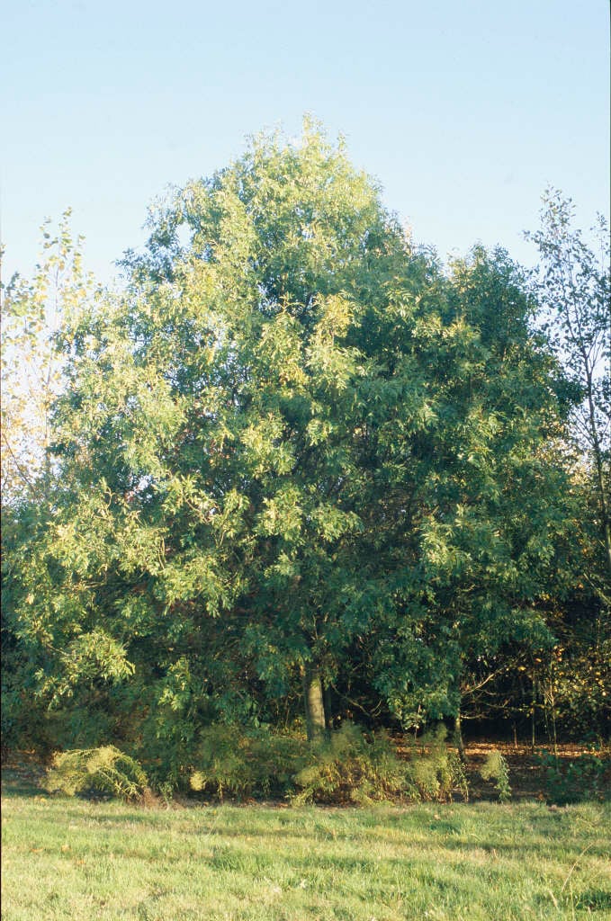 Vigorous, large deciduous tree about 15m tall, with a narrowly oval, upright crown when young, becoming more spreading with age. Leaves pinnate, opening bronze, later green, turning yellow in autumn