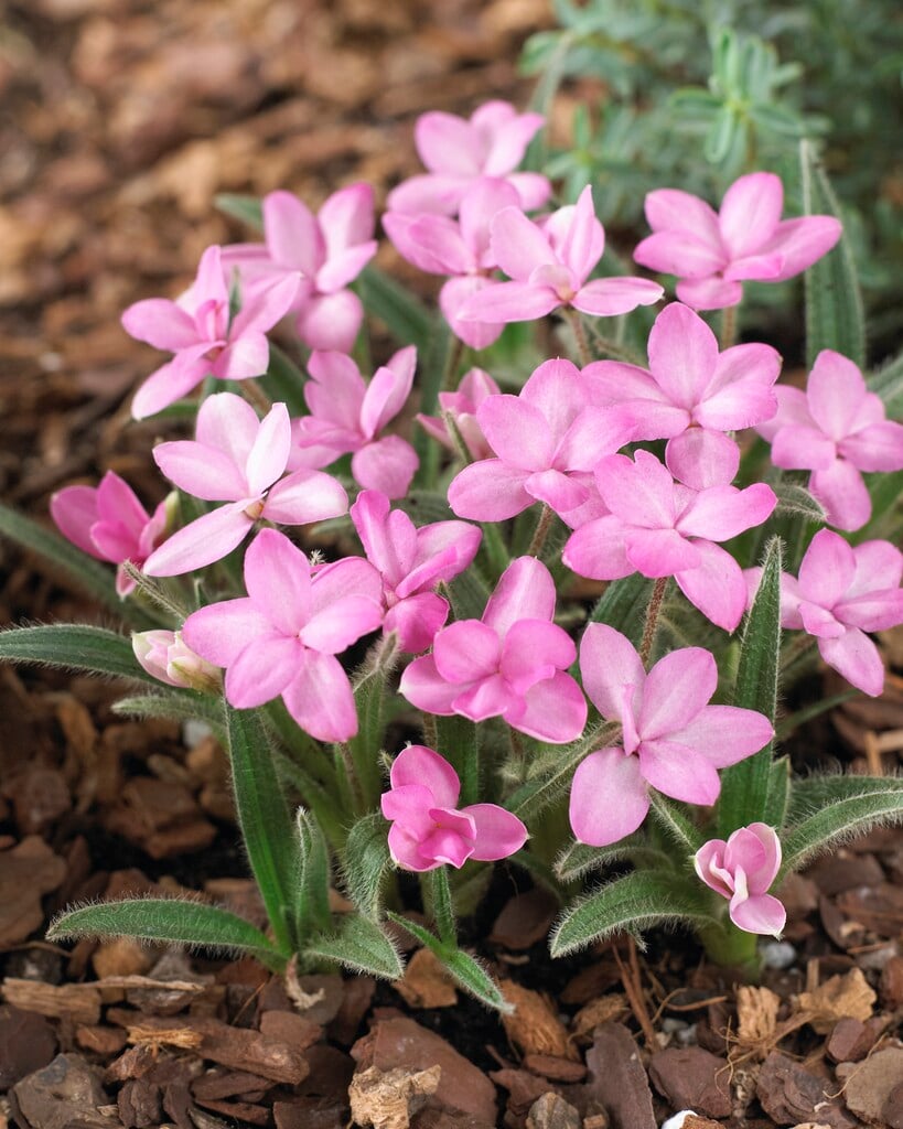 A compact, clump-forming perennial to around 10cm high, with narrowly lance-shaped, keeled green leaves covered with downy white hairs. Mid pink flowers with darker margins are borne on short upright stems throughout the summer
