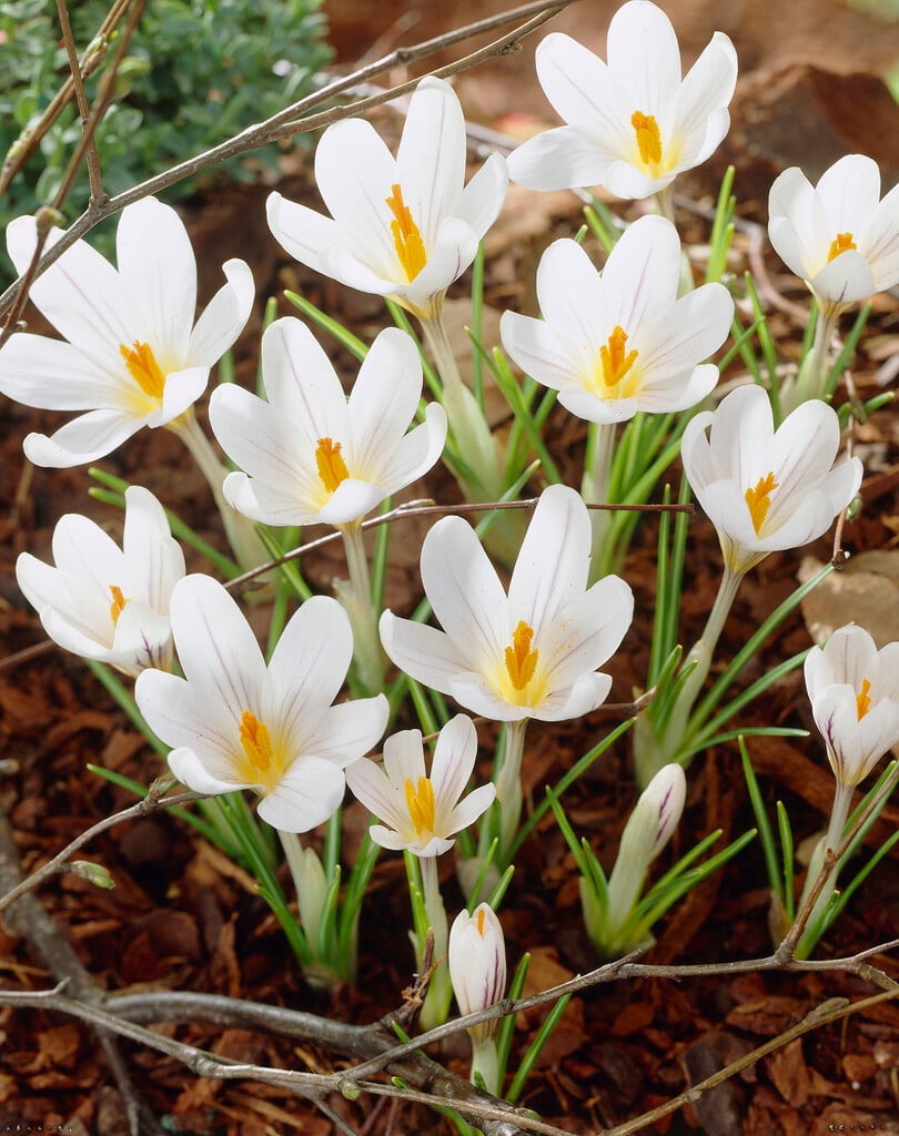 Crocus are dwarf, deciduous perennials growing from a corm, with linear leaves usually with a silvery central stripe, and goblet-shaped, sometimes fragrant flowers in autumn or early spring