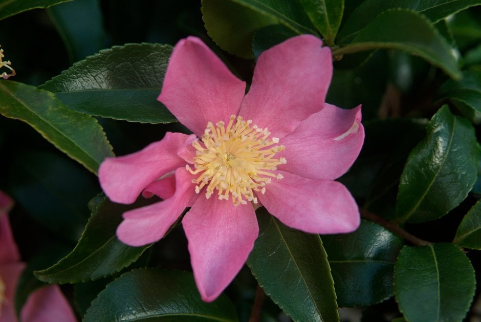 Camellia are evergreen shrubs with simple, ovate, glossy, leathery leaves and showy flowers with solitary or clustered flowers early in the year