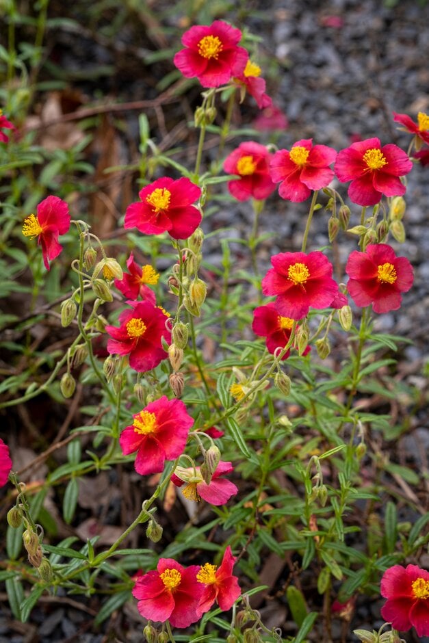 Helianthemum are bushy or spreading evergreen shrubs with small paired leaves and saucer-shaped flowers borne in short racemes in spring and early summer