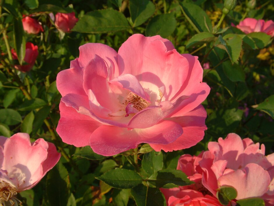 Rosa can be deciduous or semi-evergreen shrubs or scrambling climbers, with usually thorny stems bearing compound pinnate leaves and solitary or clustered flowers. Flowers may be followed by showy red or purple fruits in some varieties.