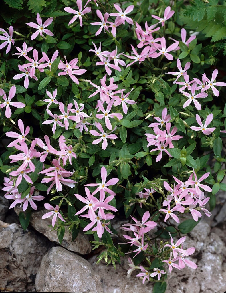 A semi-evergreen, mat-forming perennial to 15cm high with short stems clothed in small, oval leaves and open clusters of narrow-lobed, pale-eyed, pink flowers with a darker pink stripe down the centre of each petal
