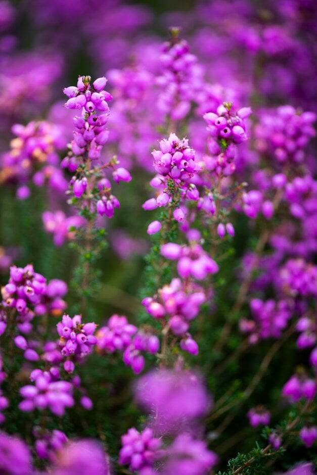 Erica can be prostrate or erect, evergreen shrubs with fine, needle-like leaves in whorls, and racemes or panicles of small, bell-shaped or tubular flowers