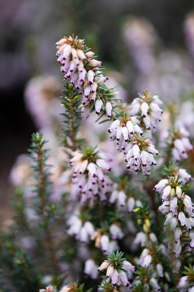 Erica can be prostrate or erect, evergreen shrubs with fine, needle-like leaves in whorls, and racemes or panicles of small, bell-shaped or tubular flowers