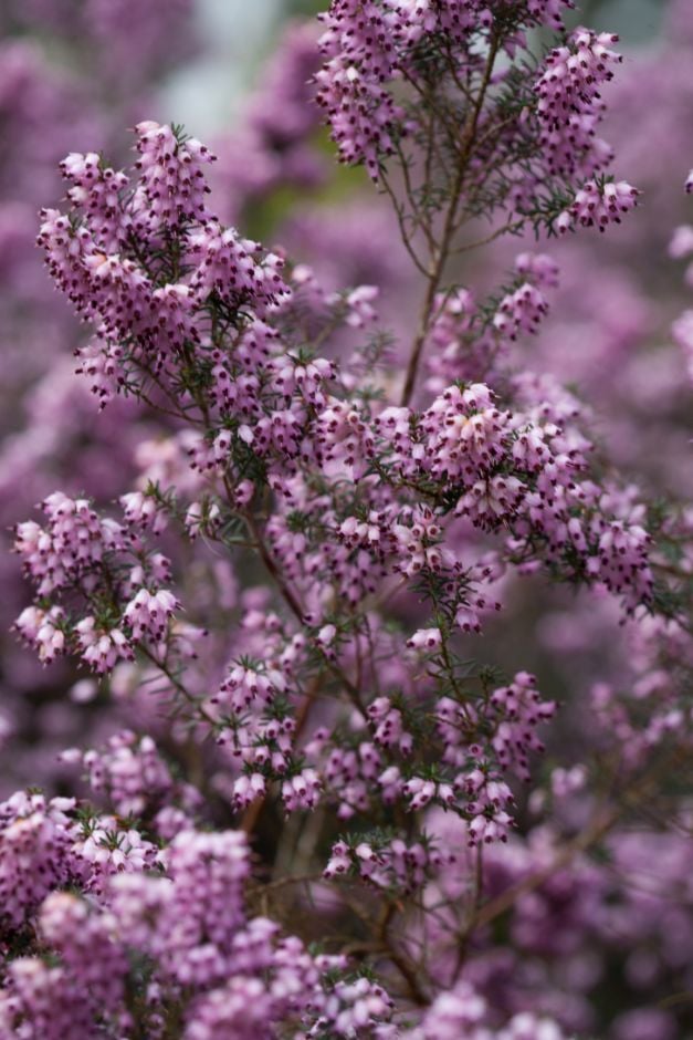Erica can be prostrate or erect, evergreen shrubs with fine, needle-like leaves in whorls, and racemes or panicles of small, bell-shaped or tubular flowers