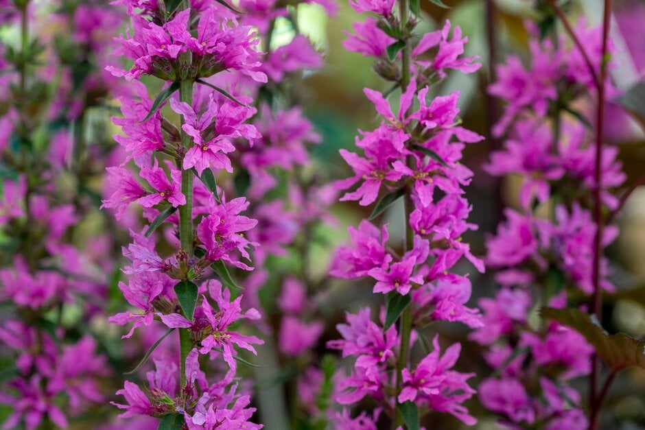 Lythrum can be annuals or herbaceous perennials, with simple leaves in opposite pairs and small star-shaped flowers in leafy racemes