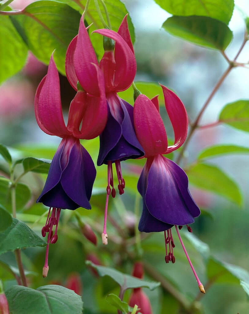 Fuchsia can be deciduous or evergreen shrubs or trees, rarely perennials, with opposite or whorled leaves and usually pendent flowers with conspicuous tubular calyx, 4 spreading sepals and 4 erect petals