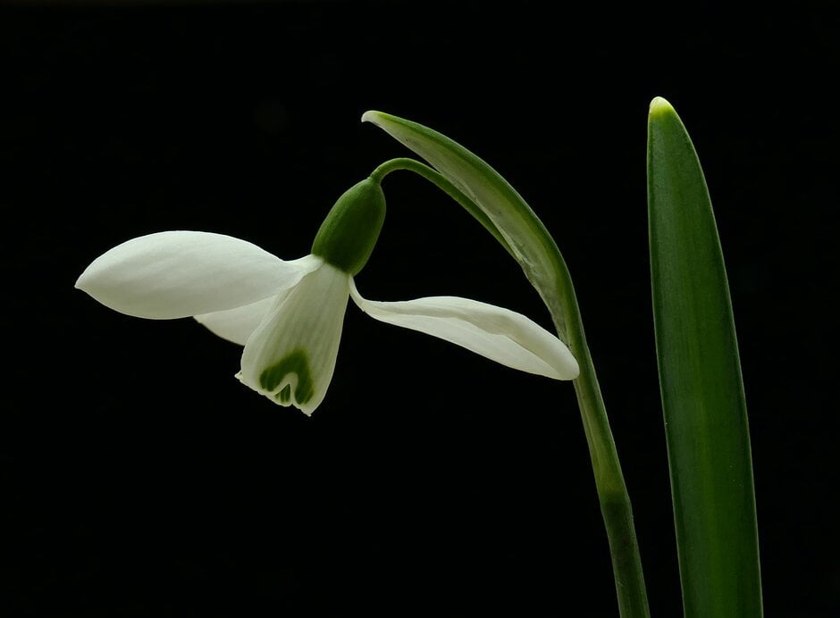 Galanthus are dwarf bulbous perennials with linear or strap-shaped leaves, and solitary, often honey-scented, nodding flowers with 3 white outer tepals and 3 smaller inner ones often marked with green