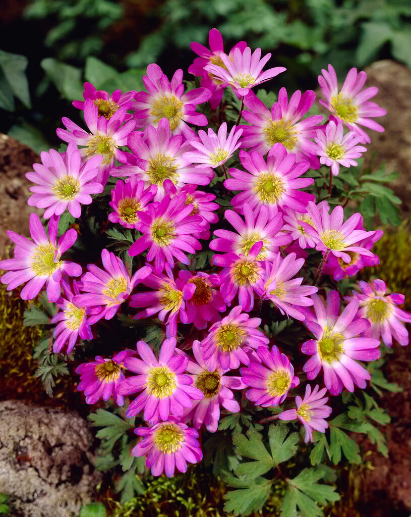 Anemone are herbaceous perennials with fibrous, rhizomatous or tuberous rootstocks, palmately lobed leaves and saucer-shaped, usually 5-petalled flowers