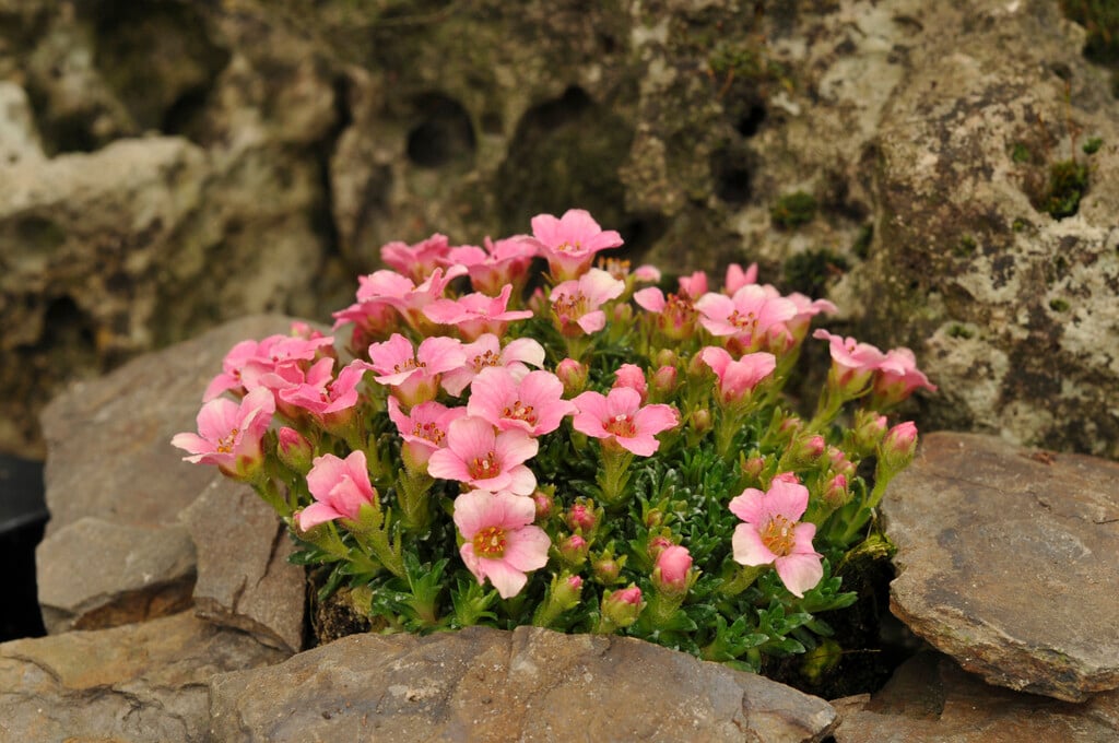 Porphyrion section saxifrages are compact, cushion or mat-forming evergreen perennials with small, usually lime-encrusted leaves, and 5-petalled white, yellow or pink flowers in early summer