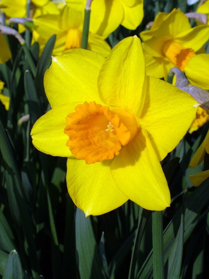 A large-cupped daffodil with dark green, strap-shaped basal leaves, bearing single flowers 9cm across, with golden yellow perianth segments and deep orange trumpets