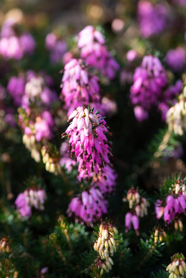 Erica can be prostrate or erect, evergreen shrubs with fine, needle-like leaves in whorls, and racemes or panicles of small, bell-shaped or tubular flowers