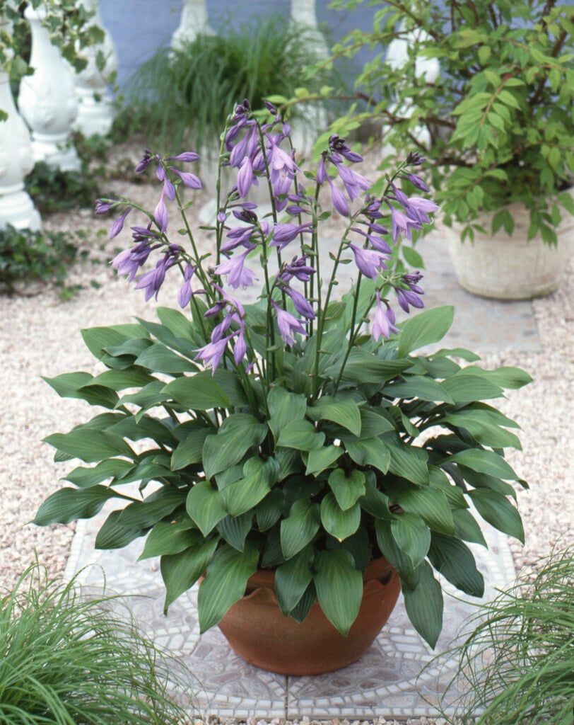 Hosta are clump-forming herbaceous perennials with simple, ovate or lance-shaped leaves, often attractively coloured or variegated, and erect racemes of nodding, funnel or bell-shaped flowers in early summer