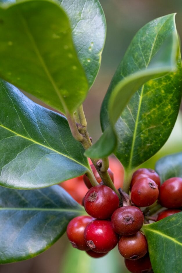 Ilex can be deciduous or evergreen shrubs and trees with often spiny leaves, small white flowers (male and female usually on separate plants) and, on female plants, showy berries in autumn