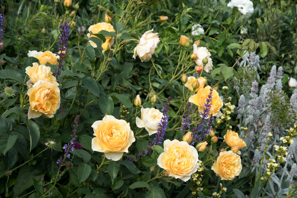 Vigorous, dense, upright rose to 1.1m tall, with healthy, glossy, dark green foliage and very fragrant, rosette-shaped blooms in shades of pale apricot and yellow, darker in the centre and repeat-flowering through summer and autumn