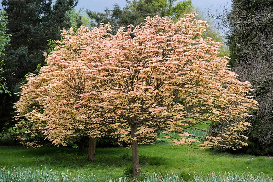 These medium to large maple trees are happy in most sites and easy to grow. Many have attractive lobed leaves, vibrant autumn colour and ornamental bark. Their distinctive winged fruits spin to the ground when ripe, earning the common names of keys, helicopters or whirlybirds.