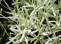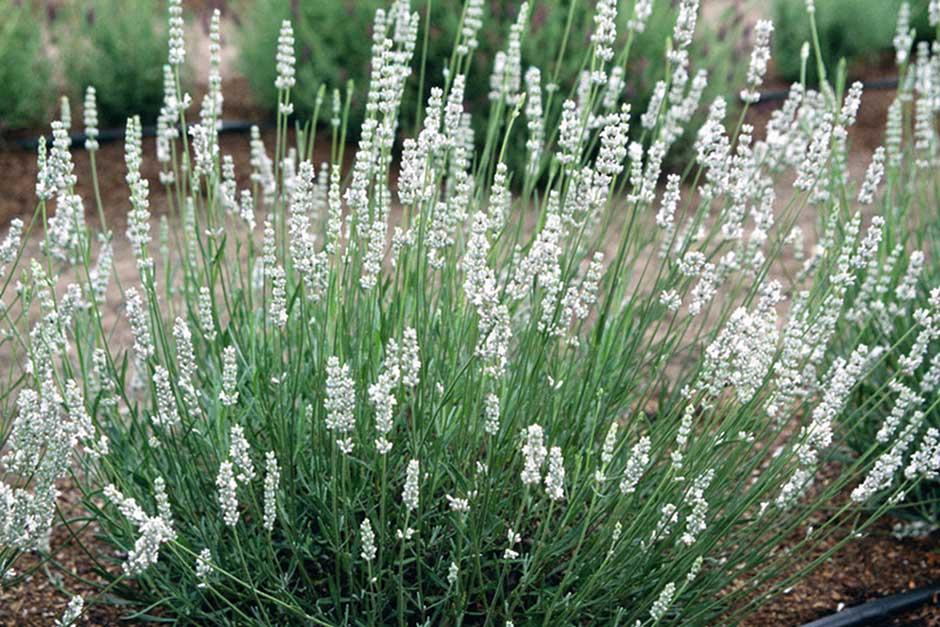 L. 'Alba' is a robust evergreen shrub creating an open dome with linear, grey-green leaves and long spikes of pure white flowers held well above the foliage in the latter half of summer. H. 50cm (1½ft) W. 90cm (3ft).