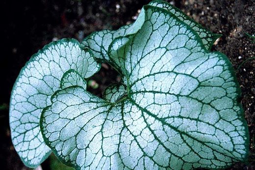 As a specimen in a 25cm (10in) pot, or as part of a mixed planting in a larger container, the brightly silvered foliage of ‘Jack Frost’ brings light to the shade in which it is happy to grow. The bold, roughly textured, heart-shaped leaves make an ideal background for the clouds of small, blue forget-me-not spring flowers. Takes some drought, but will burn if drought is combined with too much sun. 38cm (15in). Hardiness rating H6