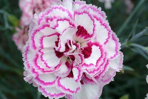 The intricate patterning of this prettily fringed flower, with its blood red heart, repays close inspection so is ideal for a sunny container on the corner of the patio or by the door – where its rich fragrance, and its grey foliage, will also be appreciated. Introduced in the mid 1960s, its stems can be weak so a little very discreet support – or the support of container neighbours - will be valuable. 35cm (14in) Hardiness rating H6