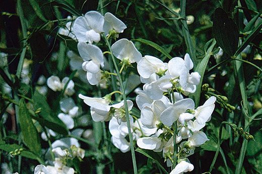 Where space allows, using this herbaceous perennial pea climber as a trailer over a retaining wall can provide a truly dramatic display. Plant at the edge, guide it in the right direction as it develops and soon its weight will send it out and over in a great billowing cloud, producing spikes of white flowers profusely for many weeks and a continuing mass of new shoots from the base. Needs plenty of space. 1.2-1.5m (4-5ft).